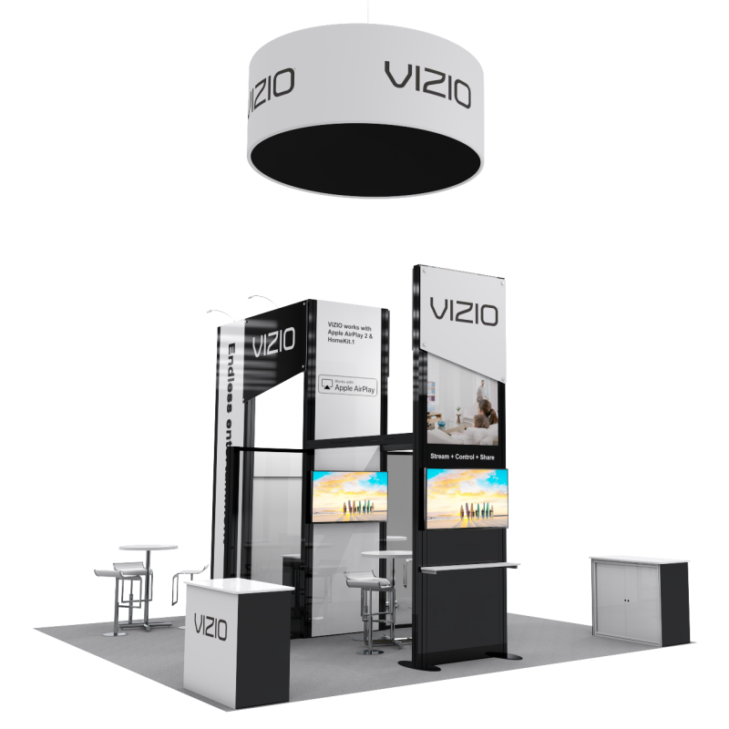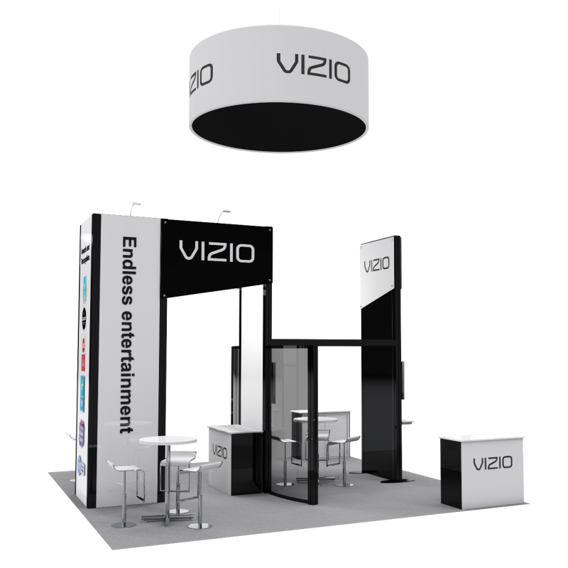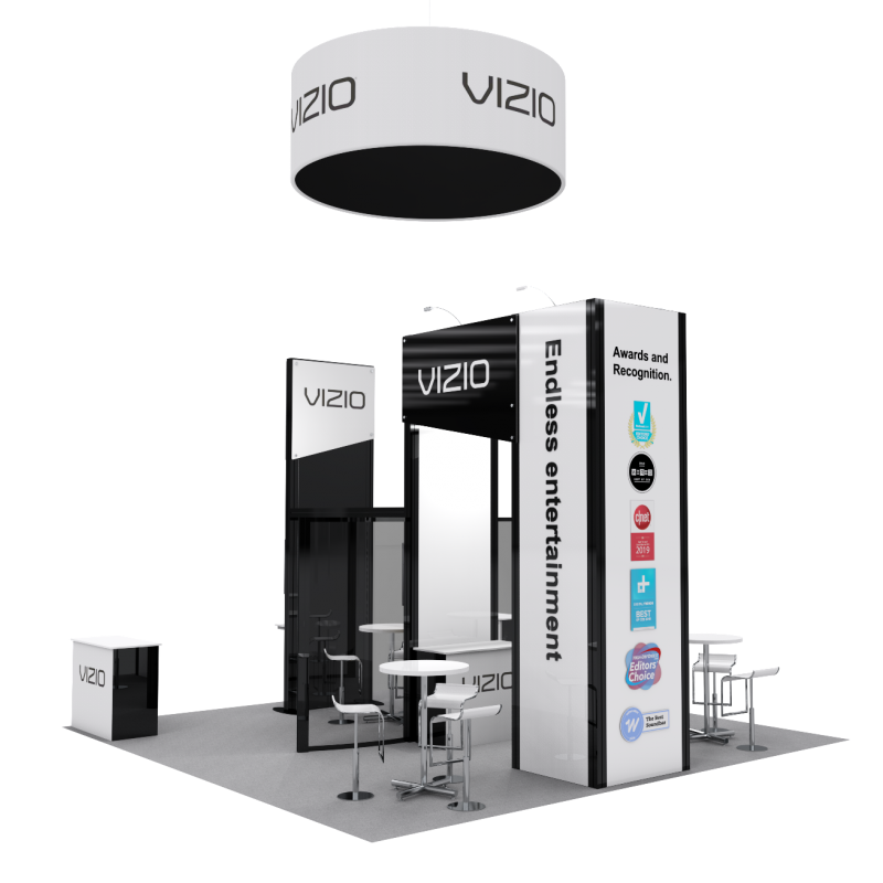 The Executive 2.0 Brand tends to the needs of the discriminating company looking for portability and ease of setup without sacrificing style or beauty!  Sleek, Modern and Portable.  All Executive 2.0 Exhibits are proudly made in the U.S.A. and feature a Lifetime warranty against any manufacturing defects.  *Tables, stools, tv’s, hanging sign, flooring, not included