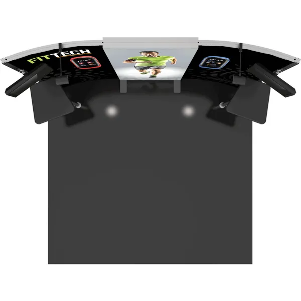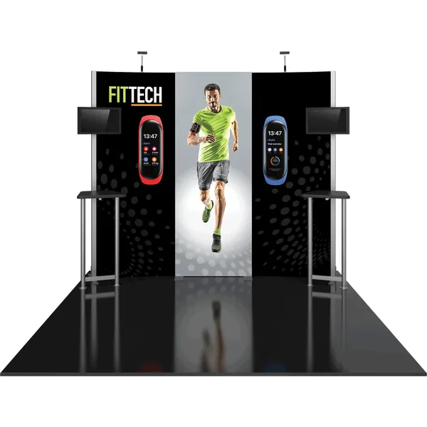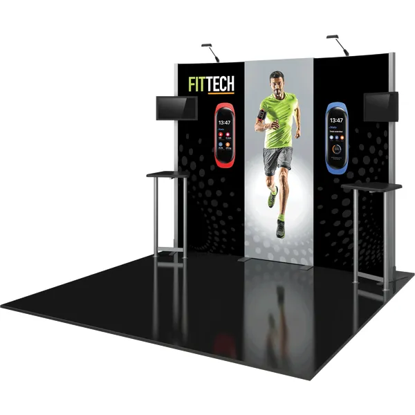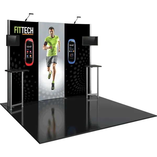 Hybrid Pro Modular Kit 01 features dual monitor mounts, back wall tables and a backlit center graphic panel to make messaging pop! LED display lighting is included for additional illumination. Count on making an unforgettable impact with Hybrid Pro Modular 10ft x 10ft Kit 01.