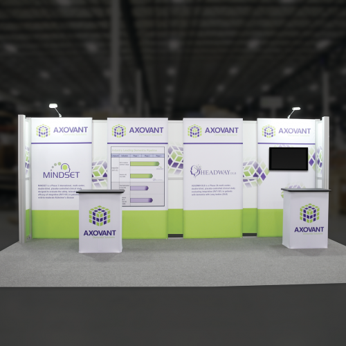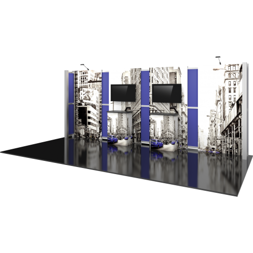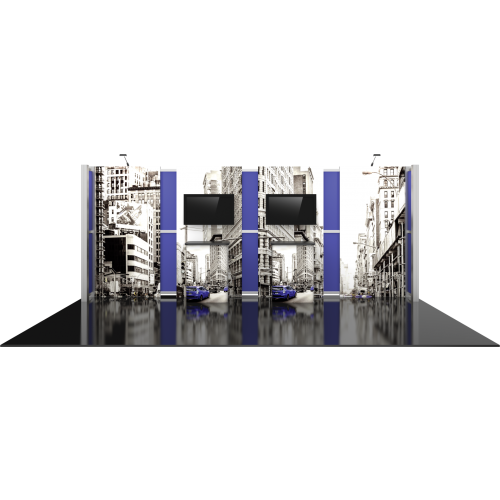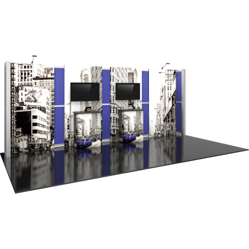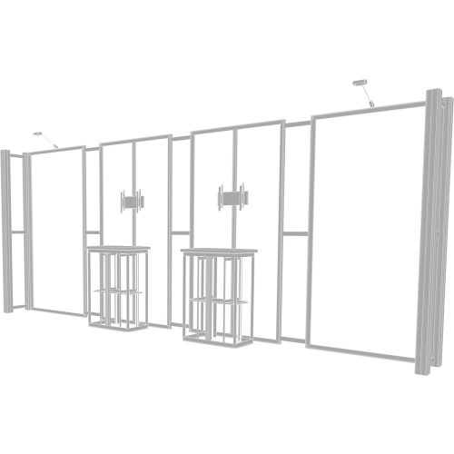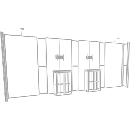 Kit 13 is accented by dual monitor mounts and back-wall counters with storage space, ideal for adding messaging and functionality to any exhibit. LED display lighting adds illumination. Kit 13 is reconfigurable into 10ft x 10ft Kit 05, increasing the value, lifecycle, and functionality of the exhibit. Count on making an unforgettable impact with Hybrid Pro Modular 10ft x 20ft Kit 13.