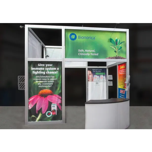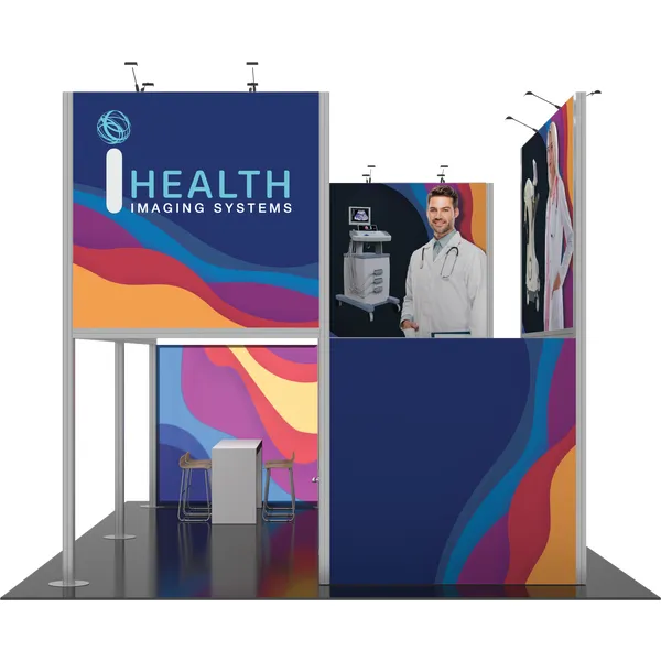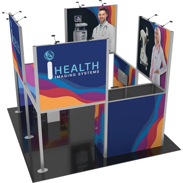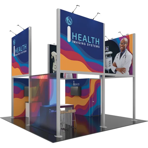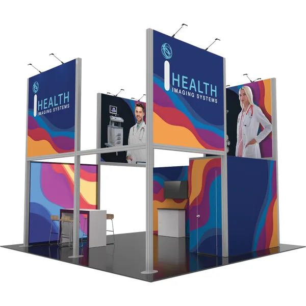 Hybrid Pro™ Modular Kit 19B is a towering and eye-catching 20ft x 20ft island exhibit, designed to draw attention to your brand. Kit 19B is available for purchase or rent. Kit 19B features an aluminum frame decorated with seamless push-fit SEG fabric graphics. Four towering display panels rise 15′ 9″ and prominently display your message and brand on the tradeshow floor. LED lights atop the structure illuminate messaging. This design features an integrated demonstration area and counter, a meeting table, as well as an integrated closet to secure stored items.