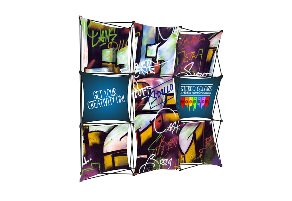The collapsible pop-up frame uses magnetic connectors with the option of J-hook connectors for more custom or weight bearing displays. Stretch fabric graphics come pre-attached to the frame, and are easily changed out in the field! Kits come with graphics, frame and drawstring carry bag. Kits displayed are our most popular versions. Eight additional frames available plus custom options per request and hundreds of graphic configurations available.